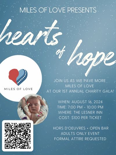 We are excited to announce our first annual Hearts of Hope Gala. We look forward to celebrating Miles' first birthday with you! The Hearts of Hope Gala will feature a presentation from Paul and Chelsea Lamb, sharing a little bit about Miles' journey and how Miles of Love is giving back to the CHD community.